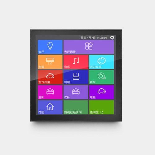 IPS display, resolution 1024*600 touch screen Multi-style homepage and slid pageTime display and setting Temperature displayWith password lock screen function HVAC functionVRV function Fresh air system functionFloor heating system function Background musicRGB strip color control Air quality sensor display8 groups of timer settings Up to 12 function pages can be configuredEnergy value or user-defined data display Switch, curtain, dimming and scene value sending function.